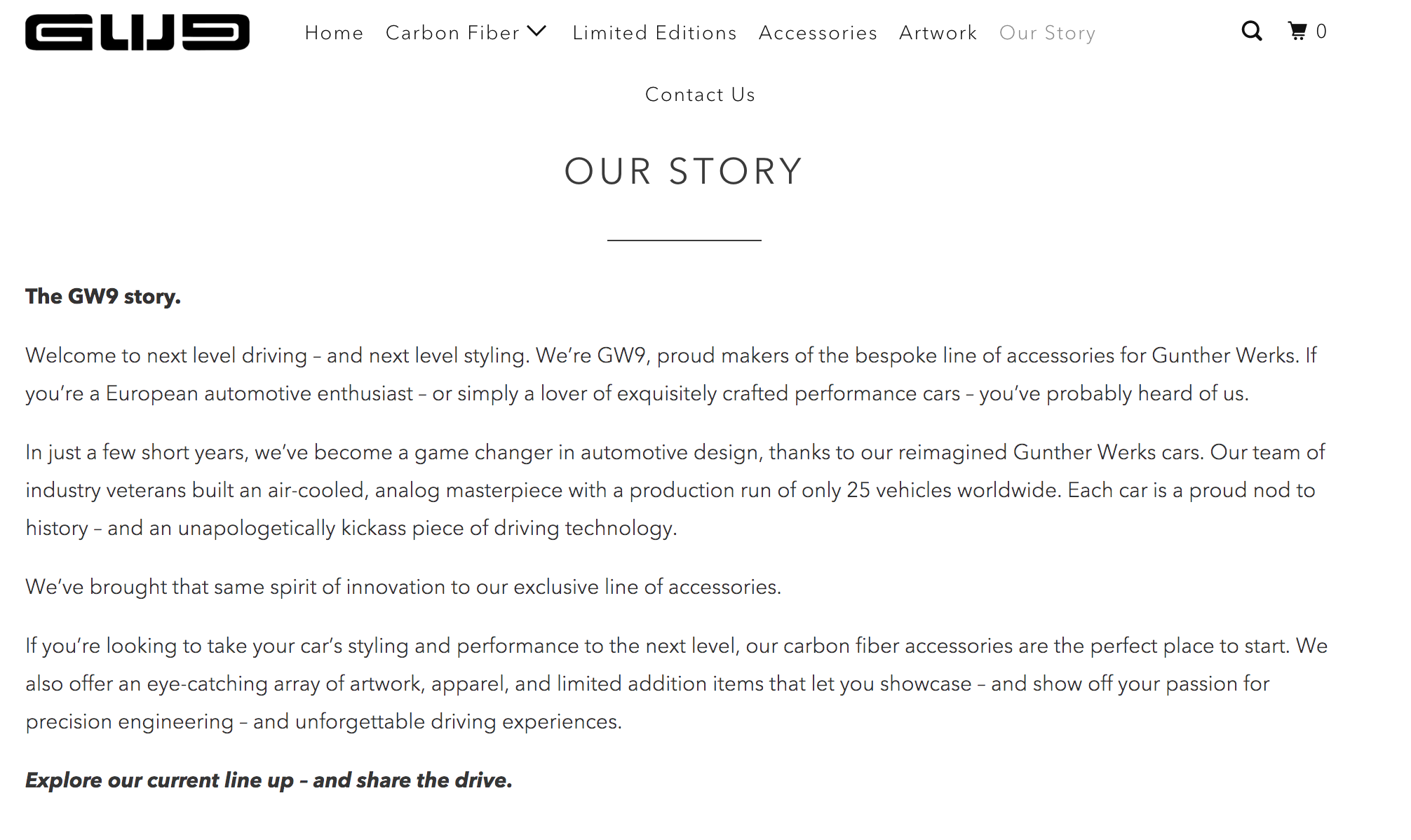 Meet Gunther Werks, a specialty automotive innovator based in Southern California. Their deal: reimagining classic Porsche models into limited-edition works of art for car enthusiasts around the world. The owners reached out to me for help on a new business venture, and as a life-long Porsche lover, I couldn’t say no. GW9 provides bespoke accessories for the cars that make our hearts beat a little faster - and our speedometers move a little further into the red.